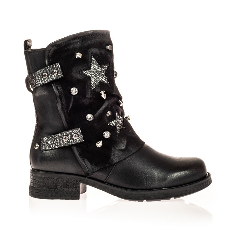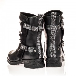 Ten oryginalny wzór traperka znakomicie sprawdzi się jesienią oraz zimą. Buty zostały wykonane z materiału skóropodobnego połączonego z zamszem. O jego charakterze stanowią wyróżniające się ozdoby. Ocieplenie to koc obuwniczy. Modna, gruba podeszwa idealnie izoluje od zimna. Od wewnętrznej strony buty posiadają suwak ułatwiający wkładanie. Wysokość obcasa 3,5 cm. Całkowita wysokość buta 21 cm ( dotyczy rozmiaru 36).