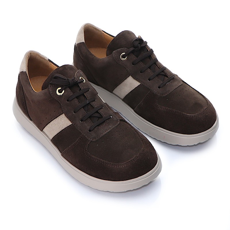 Buty sportowe typu barefoot to propozycja dla osób ceniących wygodę podczas chodzenia. Elastyczna, szeroka podeszwa zapewnia palcom swobodę oraz naturalny kontakt stopy z podłożem, miękka skórzana cholewka dopasowuje się do kształtu stopy. Wewnątrz zastosowano skórzaną wkładkę lekko podwyższoną pod piętą, co dodatkowo podnosi komfort użytkowania. Klasyczny design w modnym odcieniu czekolady sprawia, że pasują do wielu stylizacji.