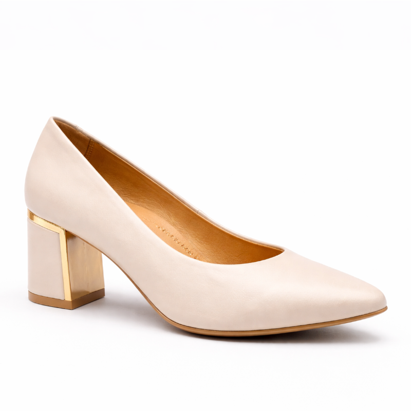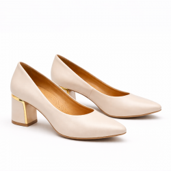 Eleganckie czółenka w ponadczasowym, beżowym kolorze, które doskonale uzupełnią zarówno codzienne, jak i biznesowe oraz wizytowe stylizacje. Model wykonany z wysokiej jakości skóry naturalnej – cholewka, jak i wkładka są skórzane, co zapewnia komfort noszenia oraz trwałość. Stabilny obcas o wysokości 6,5 cm gwarantuje wygodę przez cały dzień, a subtelny, złoty akcent dodaje butom eleganckiego charakteru.