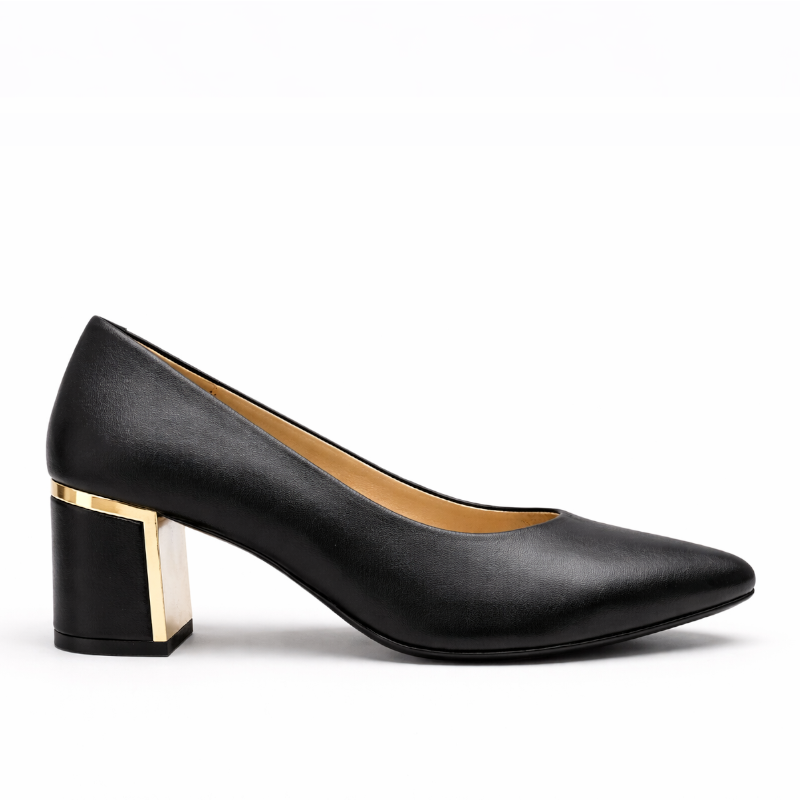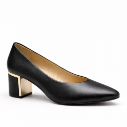 Eleganckie czółenka w ponadczasowym, czarnym kolorze, które doskonale uzupełnią zarówno codzienne, jak i biznesowe oraz wizytowe stylizacje. Model wykonany z wysokiej jakości skóry naturalnej – cholewka, jak i wkładka są skórzane, co zapewnia komfort noszenia oraz trwałość. Stabilny obcas o wysokości 6,5 cm gwarantuje wygodę przez cały dzień, a subtelny, złoty akcent dodaje butom eleganckiego charakteru.