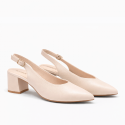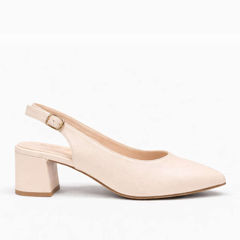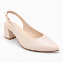 Eleganckie czółenka slingback w subtelnym, cielistym odcieniu to ponadczasowy model idealny na wyjątkowe okazje i do codziennych stylizacji. Obcas o wysokości ok. 6,5 cm zapewnia komfortowe uniesienie sylwetki, a skórzana wkładka gwarantuje wygodę noszenia. Model wyróżnia się smukłym noskiem, odkrytą piętą oraz delikatnym paskiem z regulowaną złotą klamrą, które dodają mu lekkości i elegancji.
